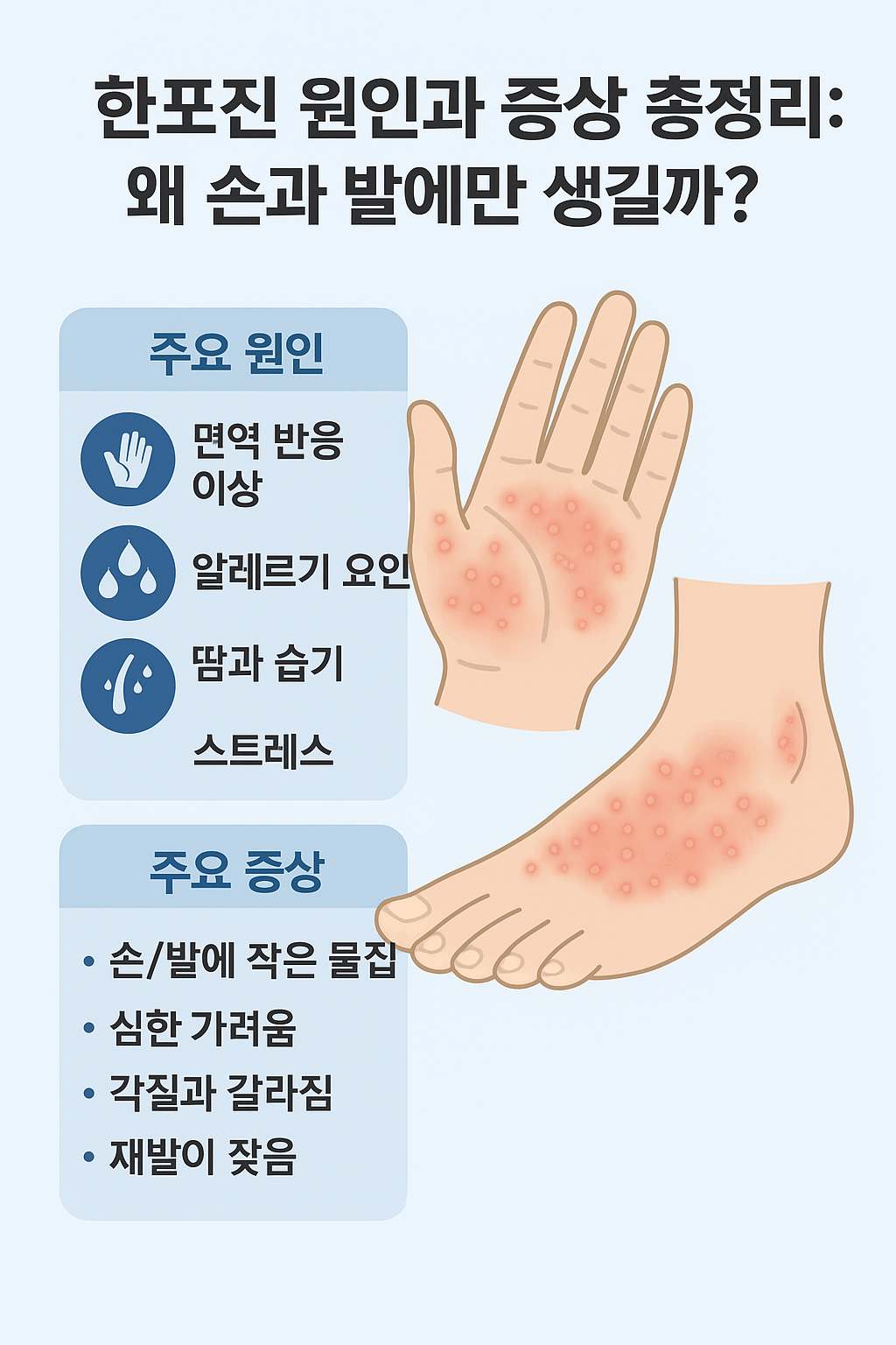 손이나 발에 작은 물집이 반복적으로 생기며 가렵고 따가운 경험을 해본 적 있으신가요? 이것이 바로 한포진(汗疱疹, dyshidrotic eczema)입니다. 한포진은 주로 손바닥, 발바닥, 손가락 옆 등에 작은 수포가 무더기로 생기는 피부질환으로, 재발이 잦아 많은 사람들을 괴롭히는 만성 피부질환 중 하나입니다. 이번 글에서는 한포진의 원인, 증상, 손과 발에 집중적으로 생기는 이유까지 자세히 정리해보겠습니다.