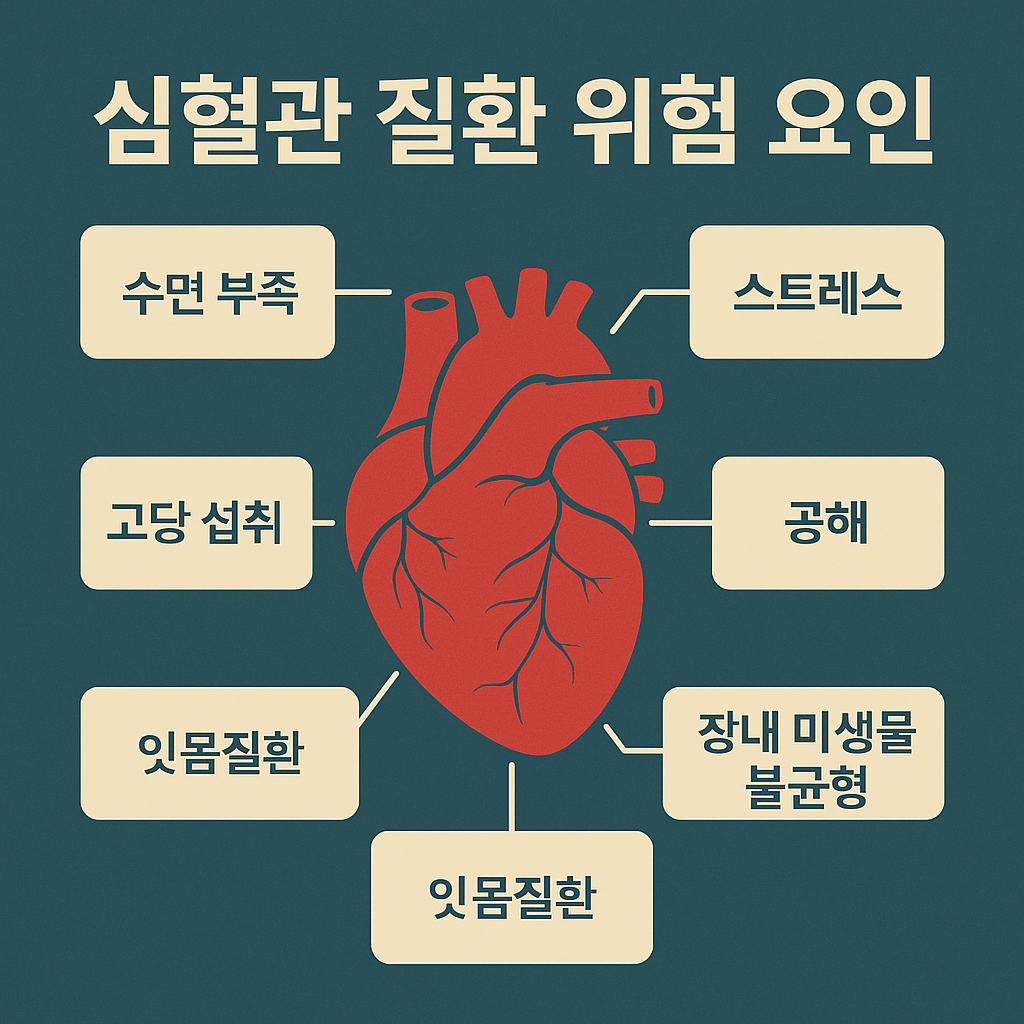 심혈관 질환은 단순히 고혈압이나 흡연, 비만 등 눈에 보이는 위험 요인만으로 발생하지 않습니다. 우리가 놓치고 있던 수면 부족, 스트레스, 공해, 장내 미생물 불균형, 잇몸 질환, 고당 섭취 등도 치명적인 원인이 될 수 있습니다. 다행히 이 요인들은 생활습관 관리와 꾸준한 관심으로 개선할 수 있습니다. 오늘부터라도 작은 변화를 시작한다면, 심혈관 질환으로부터 더 오래 건강한 삶을 지킬 수 있을 것입니다.
